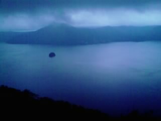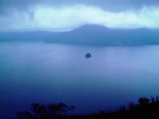 ↓湖に浮かぶ島はカムイシュ島(中島)。訪れたのは17時過ぎで陽もかなり傾いていたことと、標高が高い場所からの展望(第三展望台)となる場所のため、ただでさえ怪しい(神秘的な)装いの湖に見えたのだが・・・